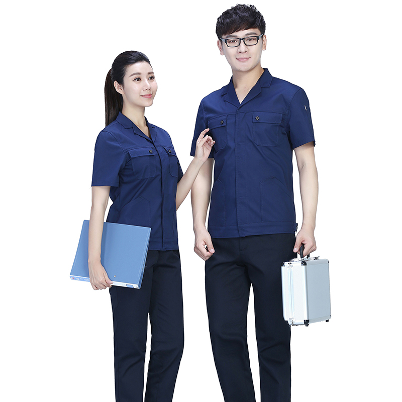 相關深藍色拼接夏季滌棉細斜短袖工作服FY633推薦