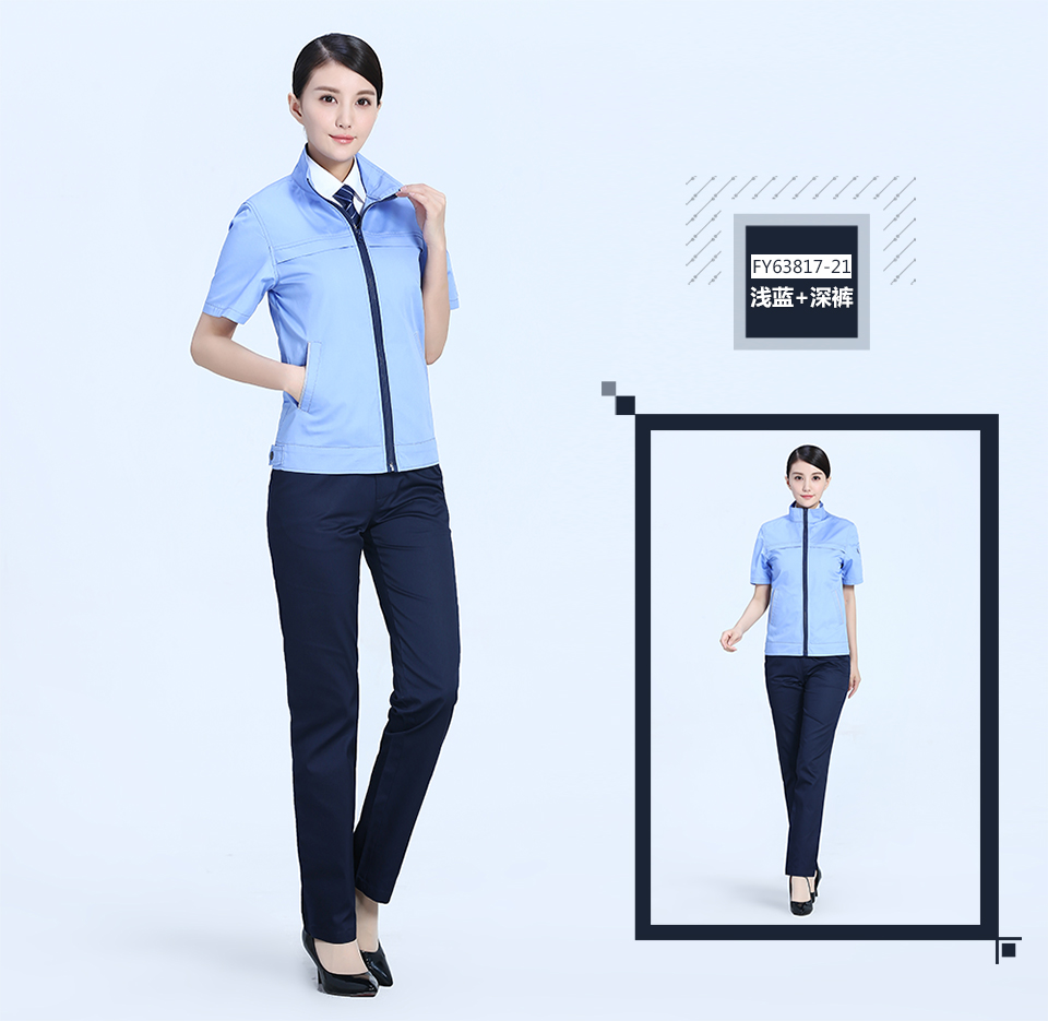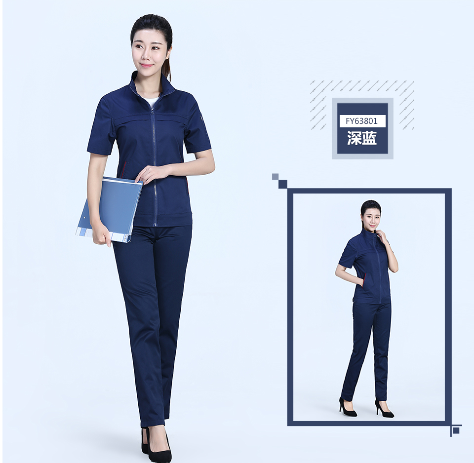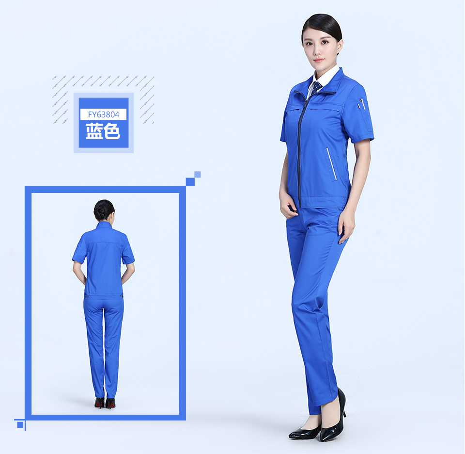 相關寶藍色拉鏈夏季時尚細斜短袖工作服FY638推薦